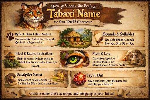 Choosing the perfect Tabaxi name is a creative and fun part of building your DnD character. The best names reflect personality, backstory, and character role. Whether you create a name manually or use a Tabaxi name generator, focus on meaning, uniqueness, and creativity.