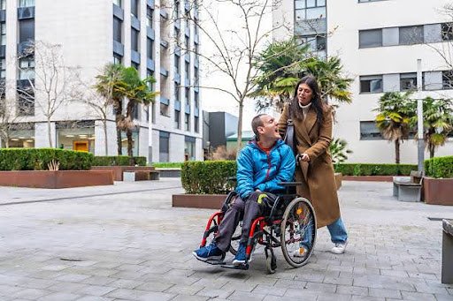 Caregiver pushing an adult man in a wheelchair on a paved area, sharing a moment and connecting while navigating an urban environment, promoting accessibility